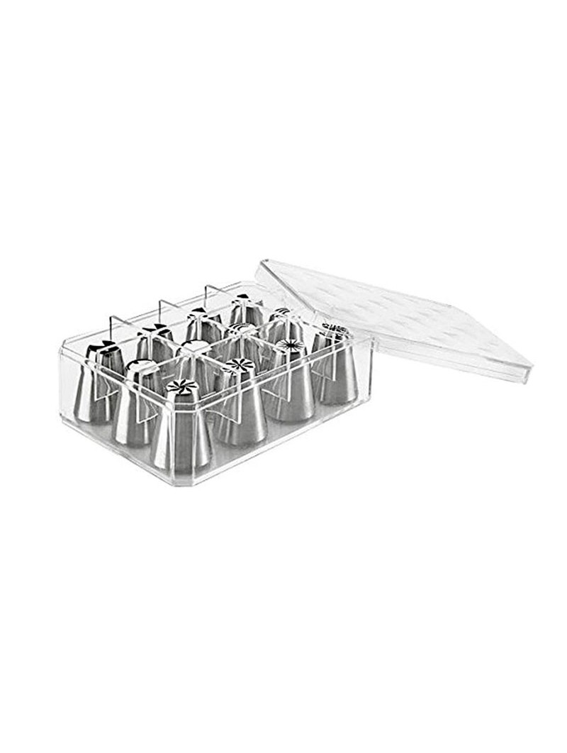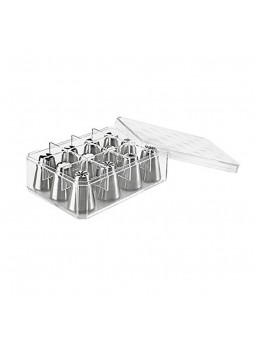 Set de 12 boquillas que permiten formar flores complejas de glasa o buttercream de forma muy fácil. Sólo tienes que colocar la boquilla dentro de la manga pastelera o acoplarla a un adaptador de boquillas adecuado. Están fabricadas en acero inoxidable de una sola pieza.